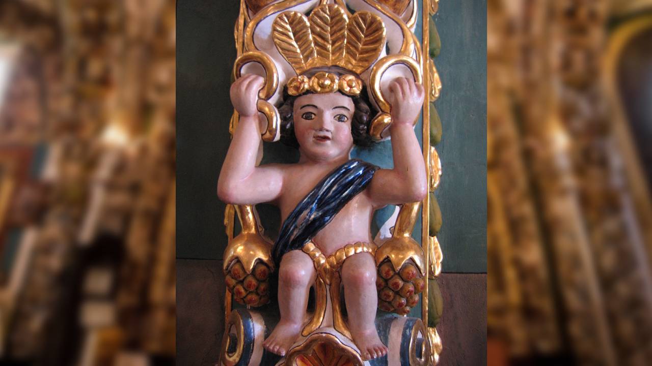 Ángeles con penachos, frutos tropicales y representaciones del cielo de Tláloc llenan cada rincón de la cúpula, otorgándole un carácter único.